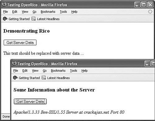 You will see from the code that the single function callRICO() is used to register both the single request handler myRequest and two response handlers. The response handlers are used to update two <div> containers; one of these contains the page's heading, the other a short text message. On making the Rico request, the contents of both are updated, leaving the page with a new title and now displaying some server information instead of the previous text message. Figure 20.1 shows before and after screenshots.
